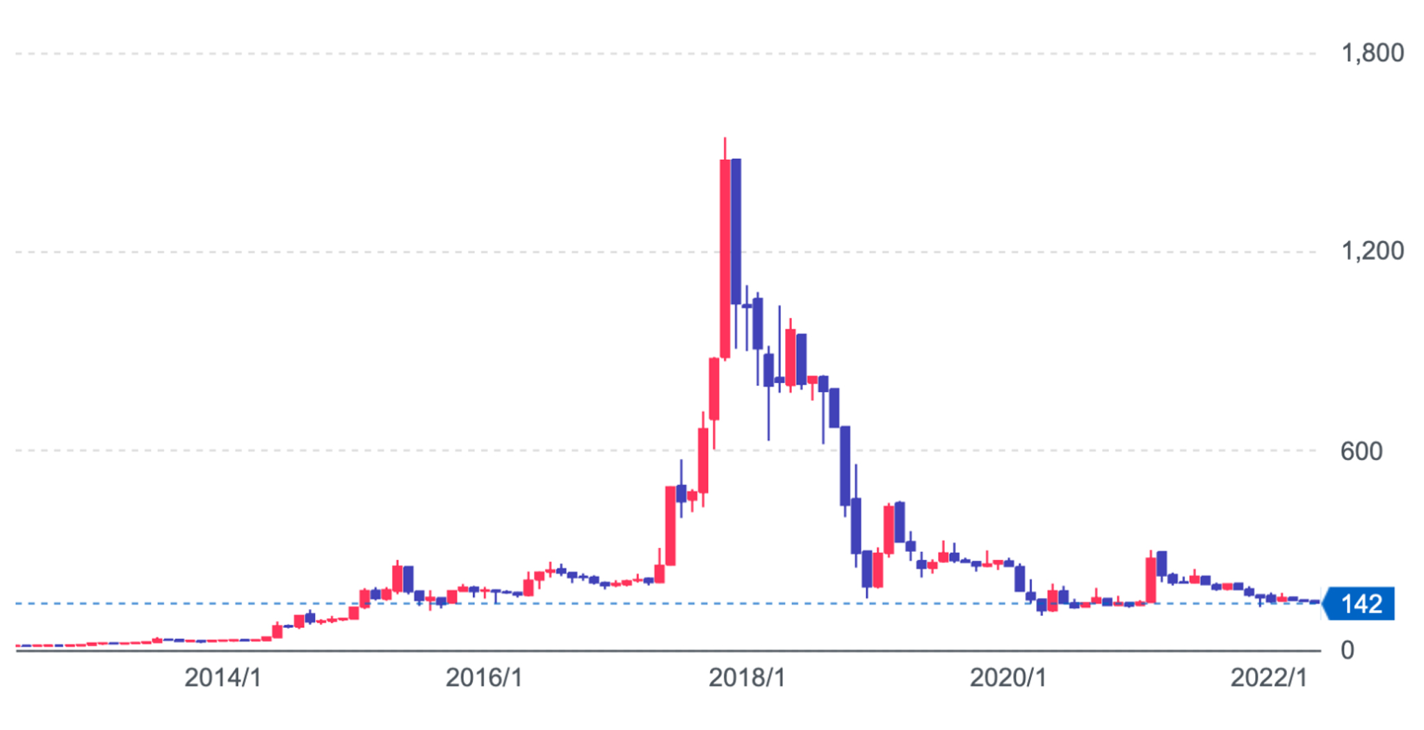 特にブームにのって株価が急騰した銘柄は急落しやすく、株価がピーク時の10分の1以下になることもザラです。