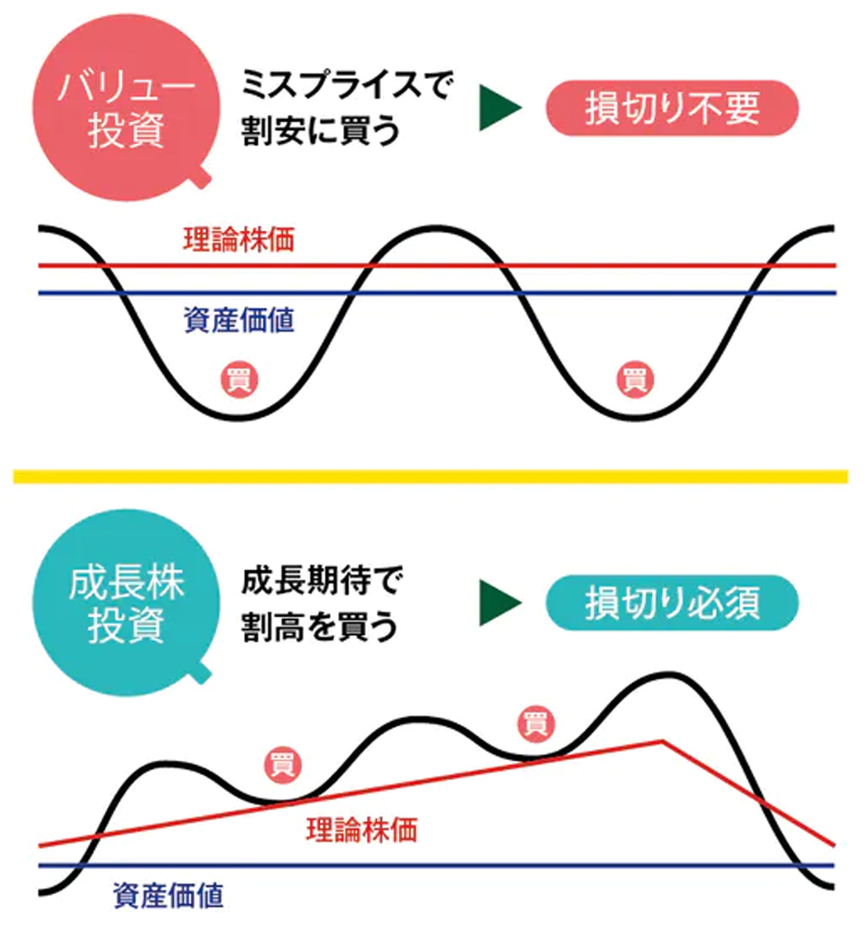 バリュー株(割安株)投資の基本的な戦略は、何らかの原因で本来の資産価値よりも株価が割安になっているタイミング(ミスプライス)で買い、適正な株価(フェアバリュー)に戻るのを待って売るものです。投資の前提である資産価値が変わらない限り、含み損が出ても損切りは必要ありません。