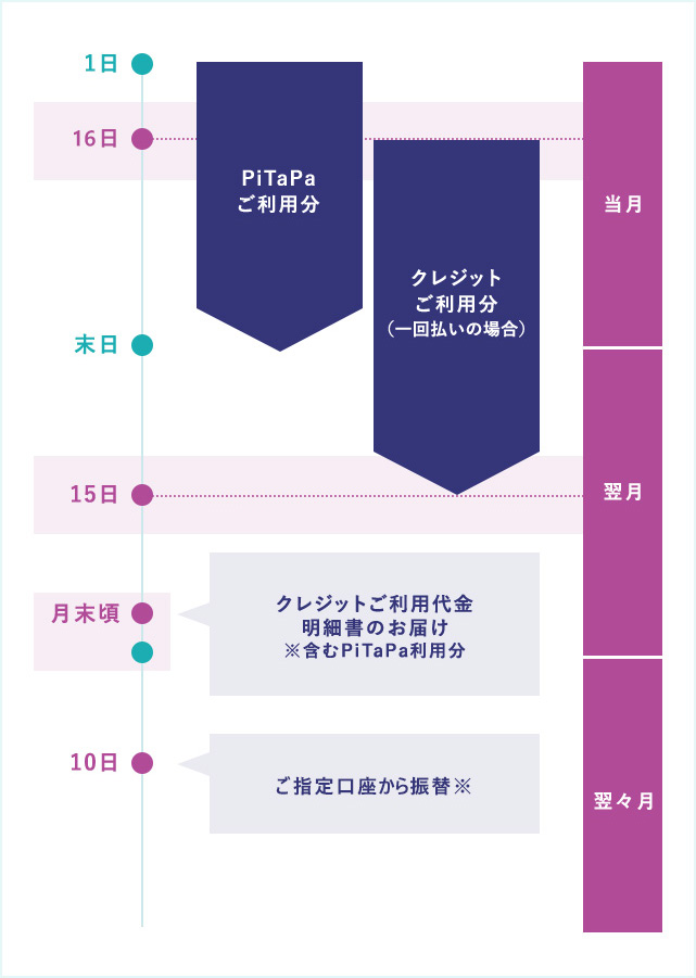 毎月1日~末日までのご利用内容を集計し、翌々月の10日(金融機関休業日の場合は翌営業日)にクレジットご利用分と共にご指定の金融機関口座から自動振替させていただきます。