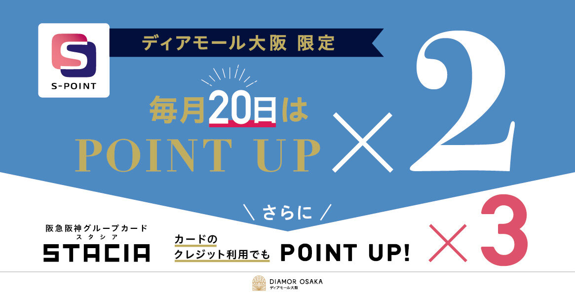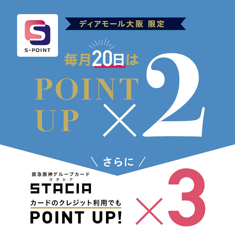毎月20日は、ディアモール大阪の対象店舗でのご利用でポイントアップ!STACIAカードまたはSポイント対象カード・アプリをディアモール大阪の対象店舗でご提示いただくと、通常1%相当[110円(税込)につき1ポイント]進呈のところ、