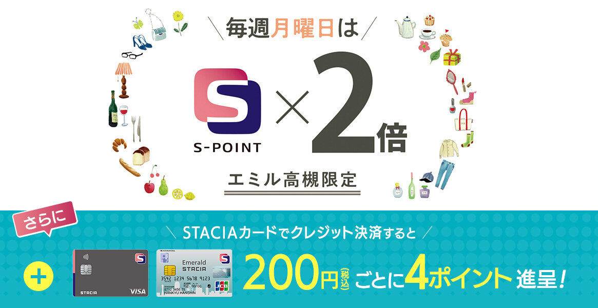 エミル高槻では、毎週月曜日はSポイント2倍!STACIAカードをご提示いただくと、通常110円(税込)ごとに1ポイントの進呈のところ、