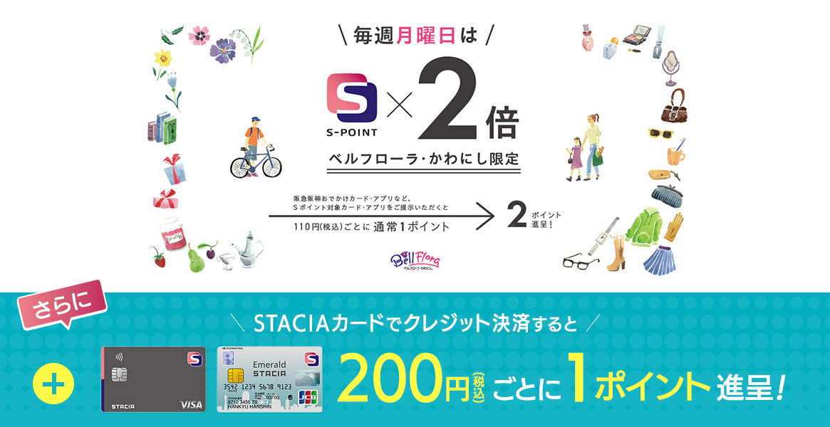 ベルフローラ・かわにしでは、毎週月曜日はSポイント2倍!STACIAカードをご提示いただくと、通常110円(税込)ごとに1ポイントの進呈のところ、