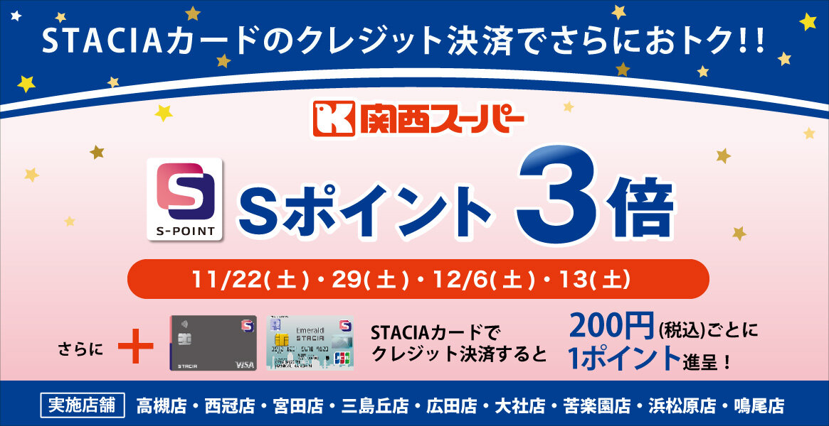 関西スーパー(対象店舗限定)において、11月22日(土)・11月29日(土)・12月6日(土)・12月13日(土)にSTACIAカードをご提示いただくと、通常0.5%相当[200円(税抜)ごとに1ポイント]進呈のところ、3倍の1.5%相当[200円(税抜)ごとに3ポイント]進呈!さらに、STACIAカードのクレジット決済なら、0.5%相当[200円(税込)ごとに1ポイント]進呈!