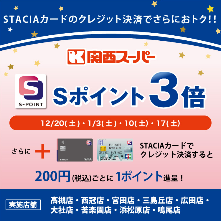 関西スーパー(対象店舗限定)において、12月20日(土)・1月3日(土)・1月10日(土)・1月17日(土)にSTACIAカードをご提示いただくと、通常0.5%相当[200円(税抜)ごとに1ポイント]進呈のところ、3倍の1.5%相当[200円(税抜)ごとに3ポイント]進呈!さらに、STACIAカードのクレジット決済なら、0.5%相当[200円(税込)ごとに1ポイント]進呈!