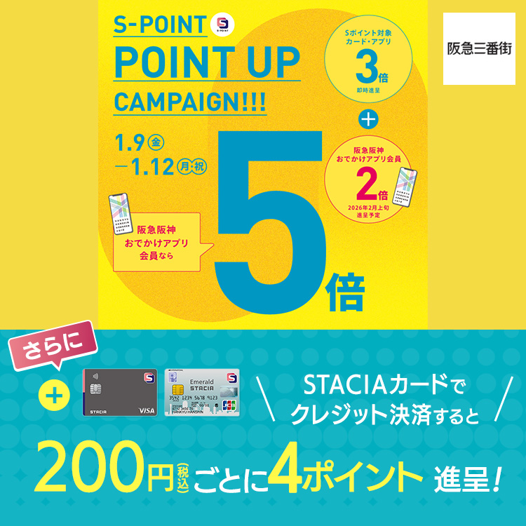 阪急三番街において2026年1月9日(金)~12日(月・祝)にSTACIAカードを含む、Sポイント対象カード・アプリをご提示いただくと、通常1%[110円(税込)ごとに1ポイント進呈]のところ、3倍の3%相当[110円(税込)ごとに3ポイント]、 さらに阪急阪神おでかけアプリ会員なら2%相当[110円(税込)ごとに2ポイント]