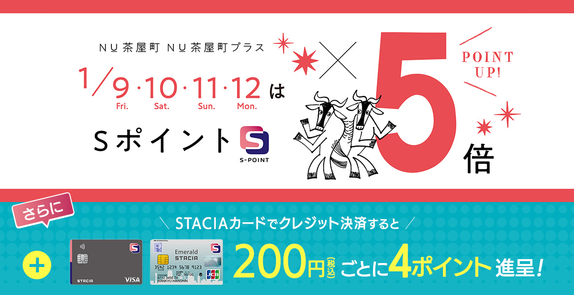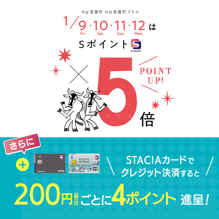 NU茶屋町・NU茶屋町プラスにおいて1月9日(金)~1月12日(月・祝)にSTACIAカードを含むSポイント対象カード・アプリをご提示いただくと、通常1%相当[110円(税込)ごとに1ポイント]進呈のところ、5倍の5%相当[110円(税込)ごとに5ポイント]進呈!さらに、STACIAカードのクレジット決済なら、2%相当[200円(税込)ごとに4ポイント]進呈!