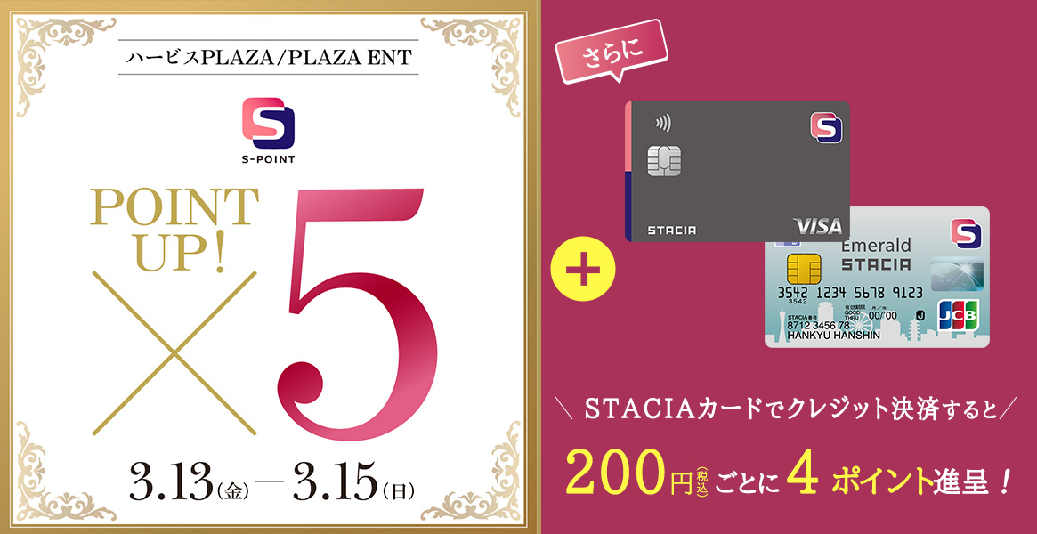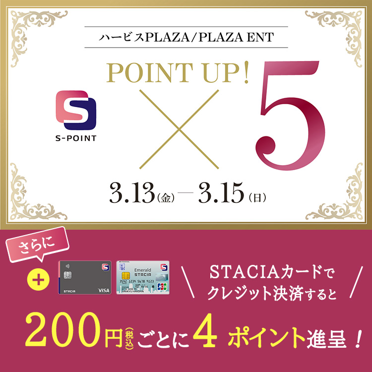 ハービス PLAZA/PLAZA ENTでは、2026年3月13日(金)~3月15日(日)にSTACIAカードを含むSポイント対象カード・アプリをご提示いただくと、通常1%相当[110円(税込)ごとに1ポイント]進呈のところ、5倍の5%相当[110円(税込)ごとに5ポイント]進呈!さらに、STACIAカードのクレジット決済なら、2%相当[200円(税込)ごとに4ポイント]進呈!
