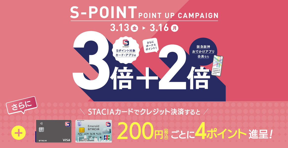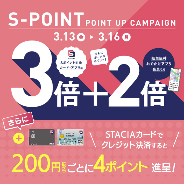 エビスタ西宮において2026年3月13日(金)~3月16日(月)にSTACIAカードを含むSポイント対象カード・アプリをご提示いただくと、通常1%相当[110円(税込)ごとに1ポイント]進呈のところ、3倍の3%相当[110円(税込)ごとに3ポイント]、阪急阪神おでかけアプリのご提示なら5%相当[110円(税込)ごとに5ポイント]進呈!※1さらに!STACIAカードのクレジット決済なら2%相当[200円(税込)ごとに4ポイント]進呈!