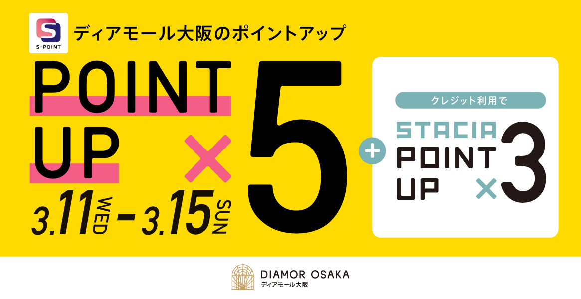期間中、ディアモール大阪の対象店舗でお買物の際、STACIAカードをご提示いただくと、通常1%相当[110円(税込)につき1ポイント]進呈のところ、5倍の5%相当[110円(税込)ごとに5ポイント]のSポイントを進呈します!
