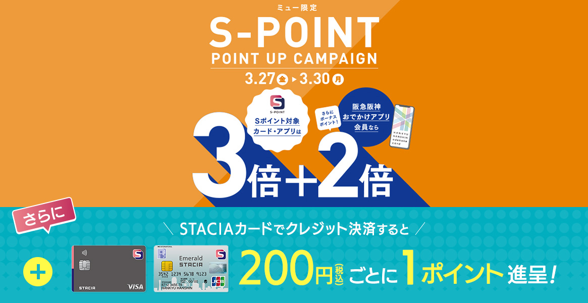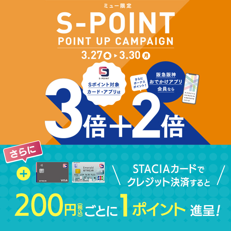 ミュー阪急桂において2026年3月27日(金)~3月30日(月)にSTACIAカードを含むSポイント対象カード・アプリをご提示いただくと、通常1%相当[110円(税込)ごとに1ポイント]進呈のところ、3倍の3%相当[110円(税込)ごとに3ポイント]、阪急阪神おでかけアプリのご提示なら5%相当[110円(税込)ごとに5ポイント]進呈!※1