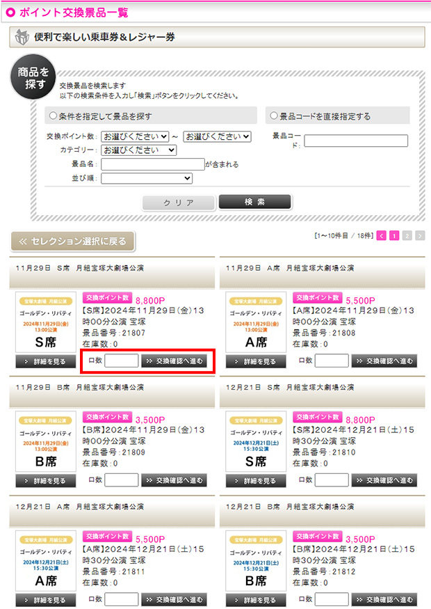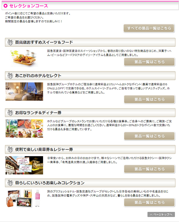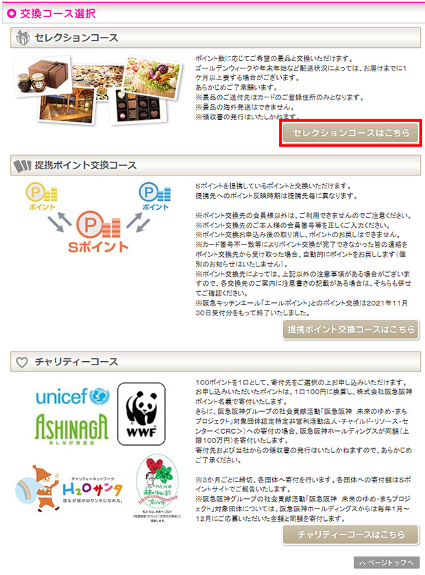交換コース選択から景品の交換を行う場合、「セレクションコースはこちら」をクリック